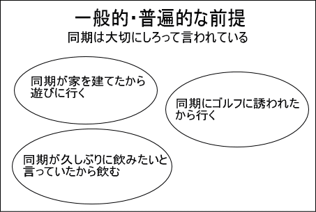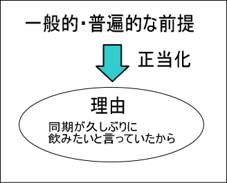 演繹法とは、一般的・普遍的な前提(同期は大切にしろって言われているじゃない)から結論(明日、飲み会に行きたい)を得る論理展開の方法です。