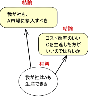 この材料からは、たとえば「コスト効率のいいCを生産した方がいいのではないか」「我が社もA市場に参入すべき」など、色々な結論がいえそうですね。